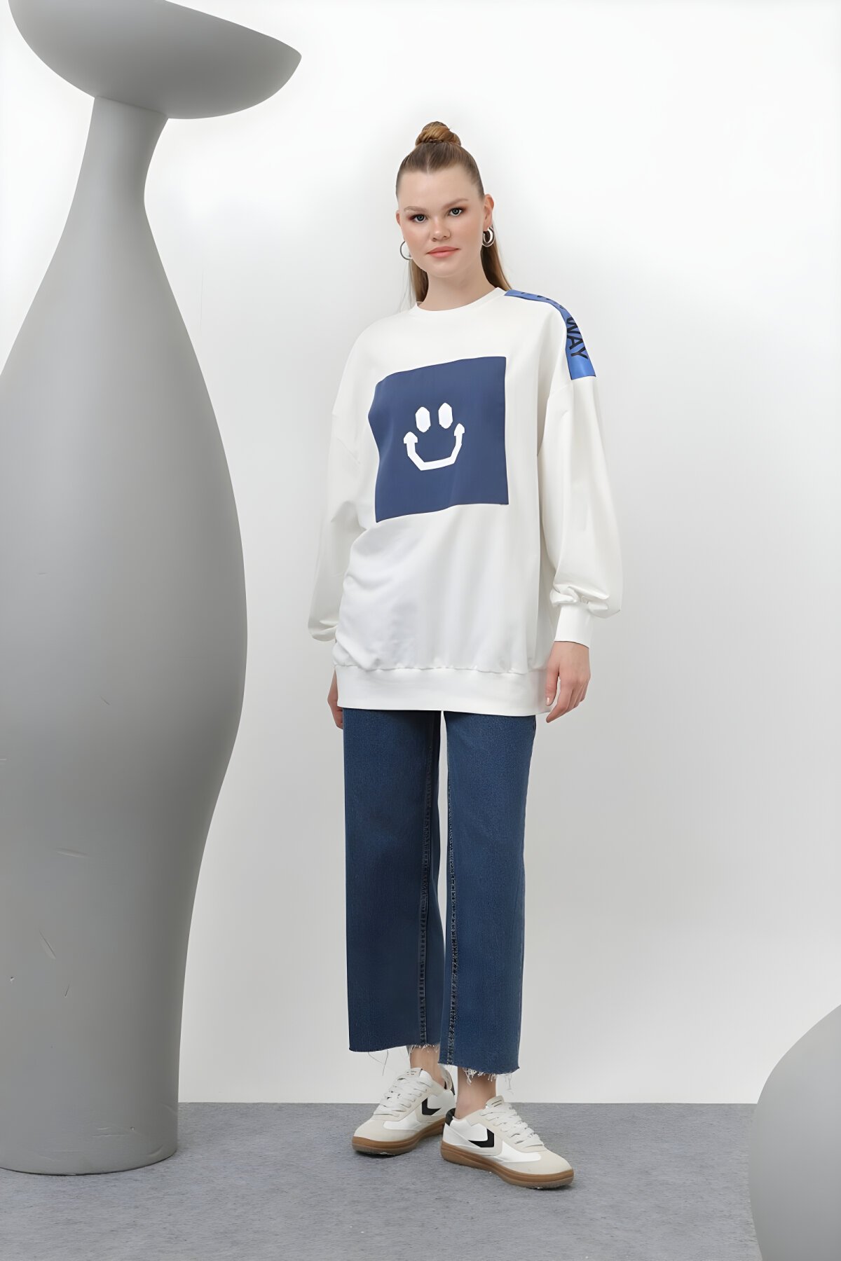 Shop the stylish Puane Oversize Smile Print Modest Tunic in Ecru, perfect for comfortable daily wear. Devr-i Tesettür offers a curated selection where high-quality modesty meets contemporary design. Find your new favorite modest tunic today! (198 characters, 32 words)