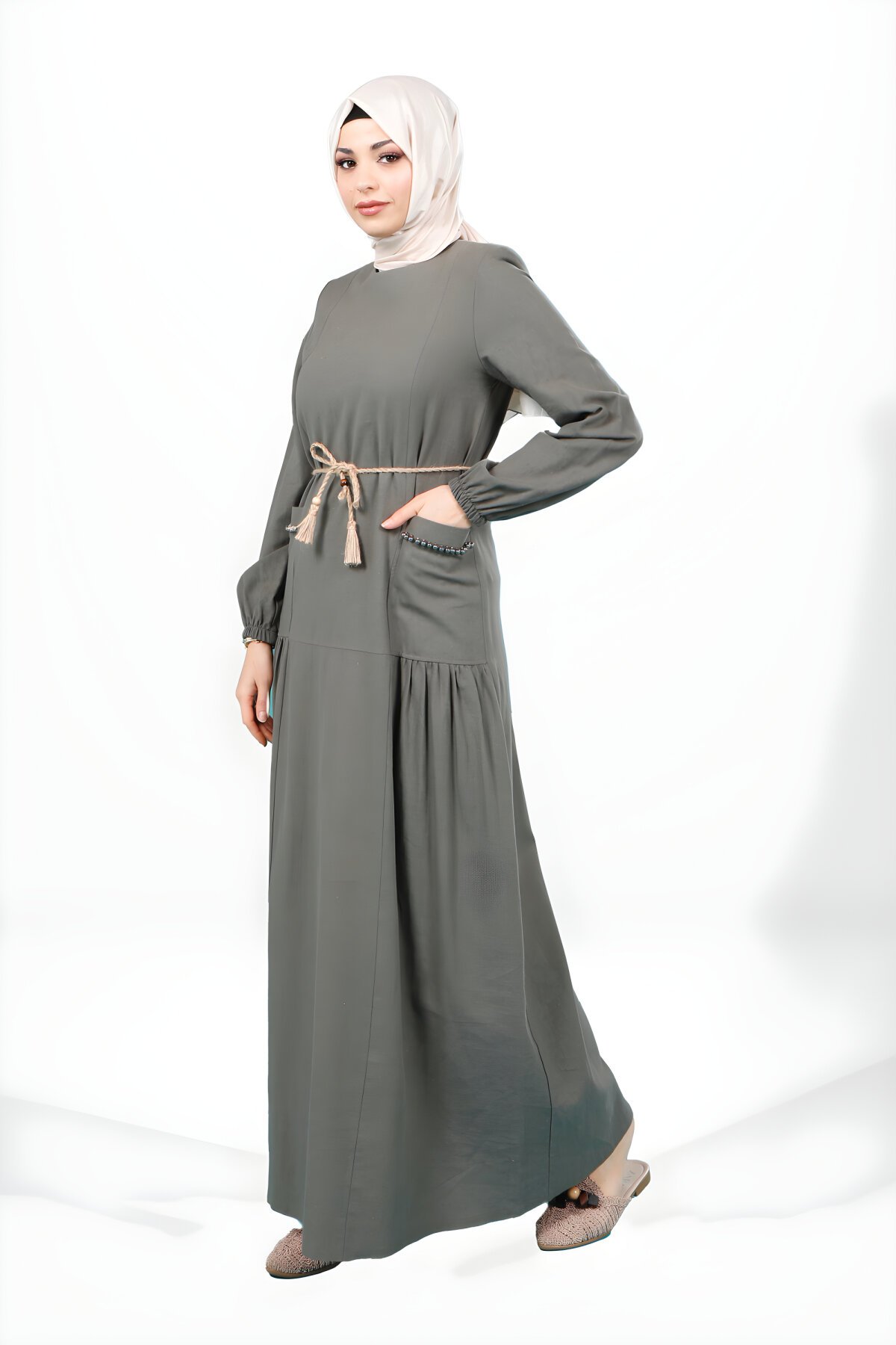 Discover the new Khaki Crew Neck Modest Dress by Beyza, exclusively available on Devr-i Tesettür. This elegant piece offers a comfortable fit, featuring a stylish removable rope belt for adjustable styling and a unique embellished stoned pocket detail, making it perfect for everyday modesty and special occasions. Shop Beyza.