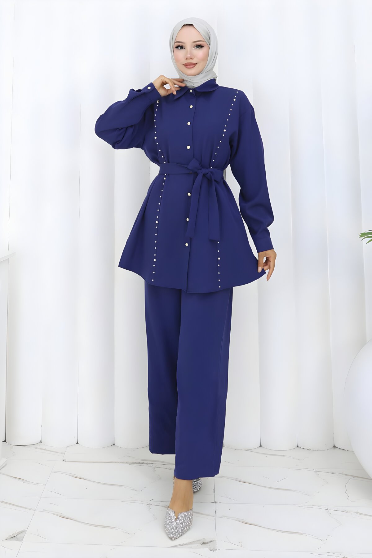 ModamihramIndigo Two-Piece Set with Pearl Details and Belt
