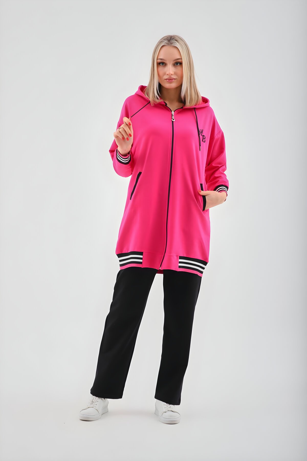 Produced from high-quality two-thread fabric. The jacket is detailed with striped ribbing on the sleeves and hem. Full-length zipper closure, hooded and with a kangaroo pocket at the front. Jacket length: 80 cmPants are wide-leg and have an elasticated waist. The sporty combination consists of 2 pieces. Designed to suit your Daily Sportswear and Modest Sportswear set preferences. Model Height: 172 cm and the product on the model is Size M. 50-55 Kg - Size S 55-60 Kg - Size M 60-67 Kg - Size L 67-75 KG - Size XL 75-85 Kg - Size 2XL are the ideal measurements. These measurements are determined according to Height/Weight compatibility; please request a size selection suggestion outside of these.